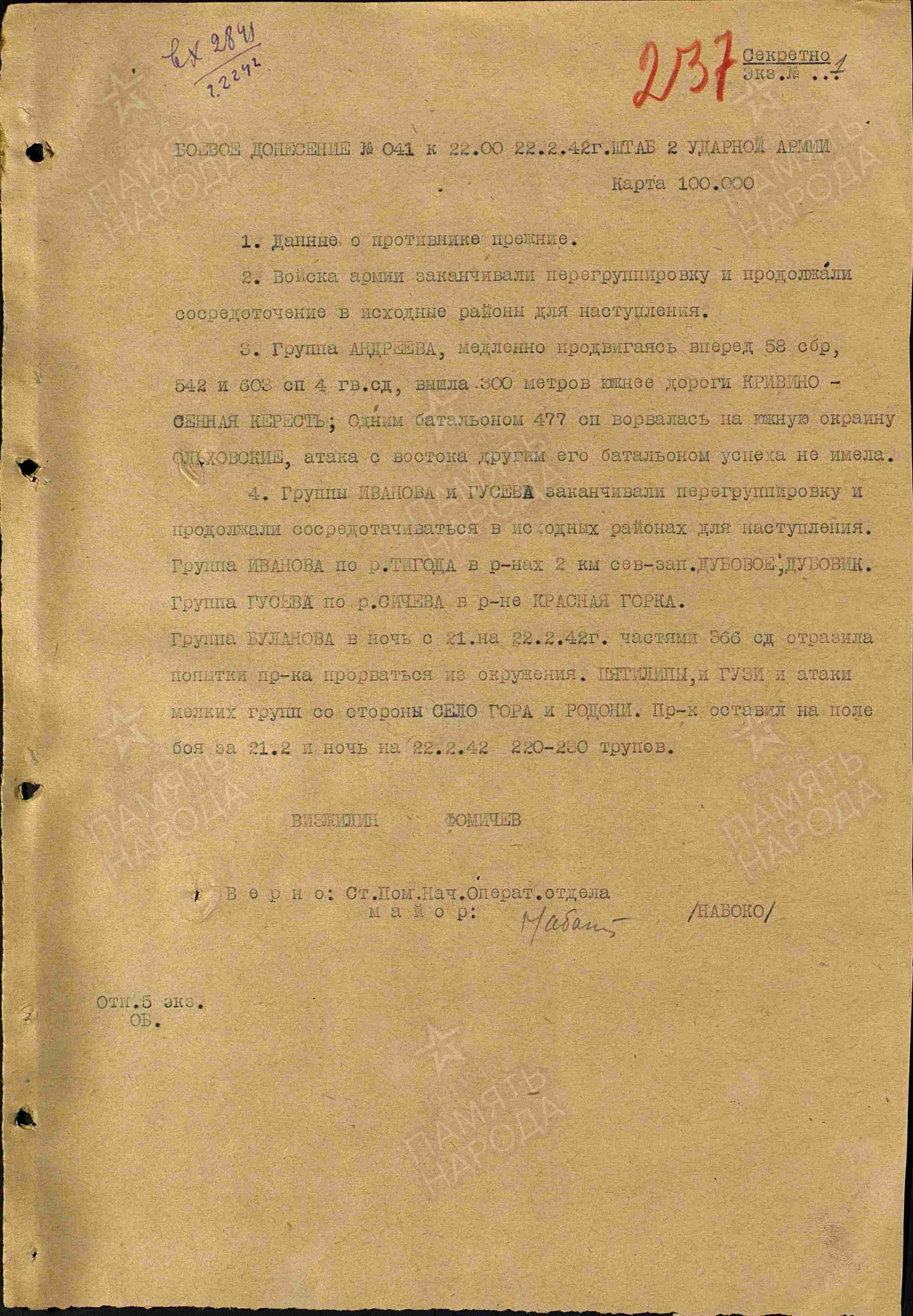 Боевое донесение штаба 2 УА за 22 февраля 1942