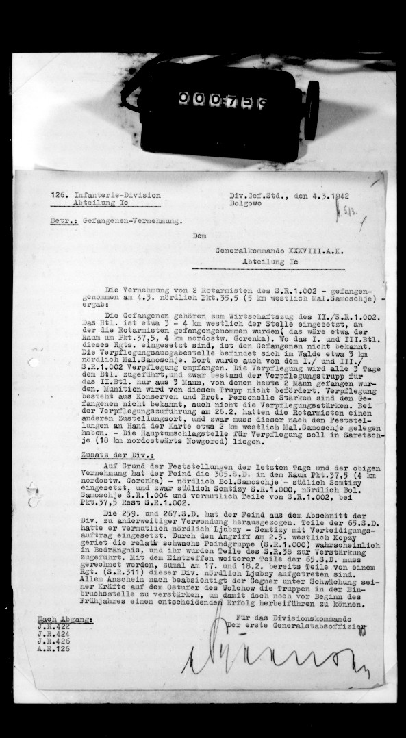 Пленные служили в хозяйственном взводе 2-го батальона 1002-го сп. Этот батальона находится примерно в 3-4 км от места, где пленили этих красноармейцев (это примерно район отм.37,5 в 4 км северо-восточнее Горенки). Где находятся 1-й и 3-й батальоны этого полка, пленным неизвестно. Пункт выдачи продовольствия расположен в лесу примерно в 3 км севернее Мал.Замошья. Оттуда же продукты питания получают 1-й и 3-й батальоны 1002-го сп. Продукты перевозятся в батальон раз в 3 дня, при этом вое из троих солдат продовольственного снабжения 2-го батальона сегодня попали в плен. Боеприпасы они не возили. Еда состоит из консервов и хлеба. Численность личного состава пленным неизвестна, но она не соответствует численности, состоящей на довольствии. 26.2 пленные получали продукты на другом пункте выдачи, который, как они показали на карте, расположен примерно в 2 км западнее Мал.Замошья. Главный пункт перевалки продовольствия – это Заречье (в 18 км северо-восточнее Новгорода).