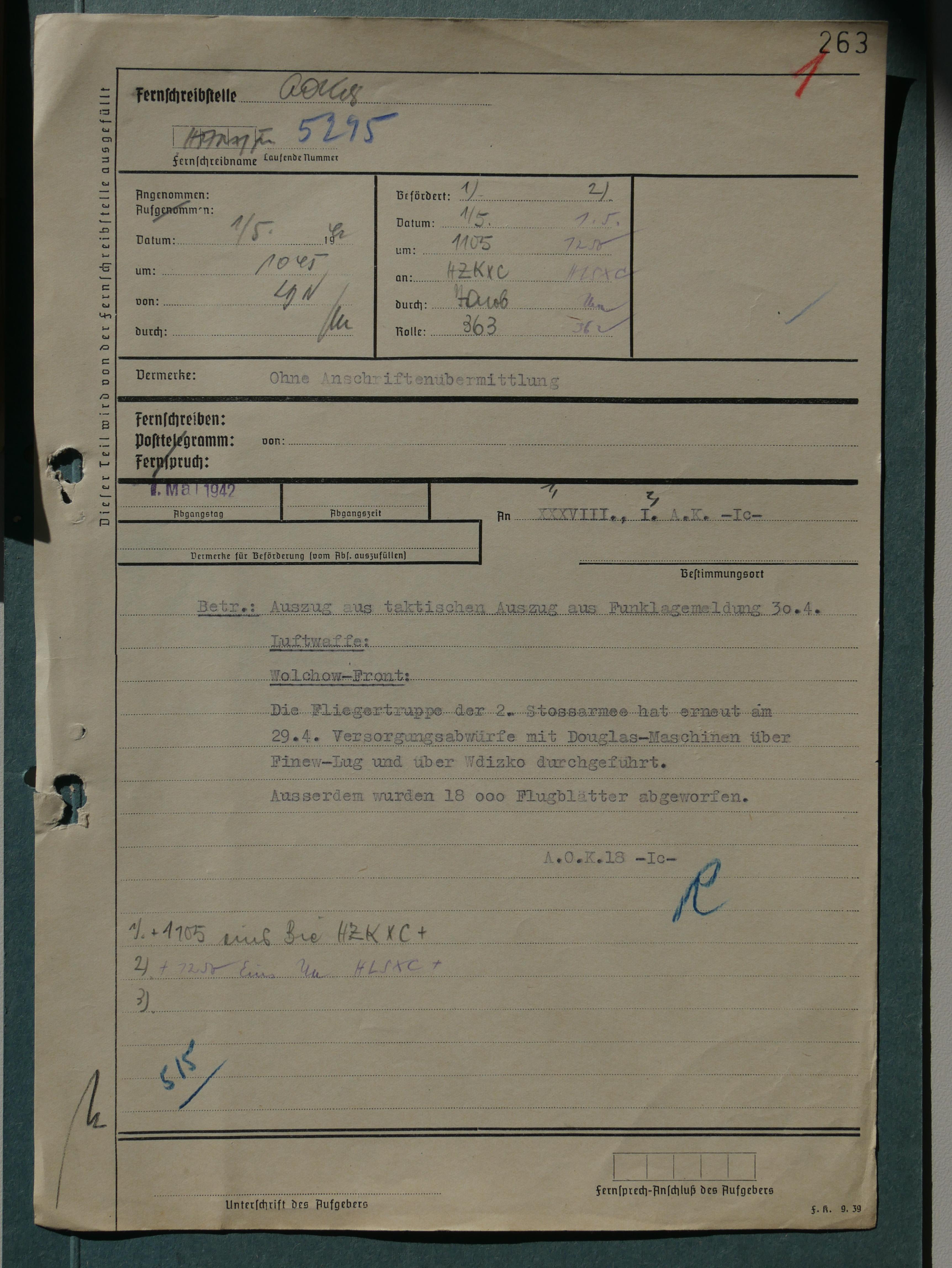 Волховский фронт: «ВВС 2-й ударной армии 29.4 снова провели сбросы грузов снабжения с самолетов «Дуглас» на Финев Лугом и Вдицко.